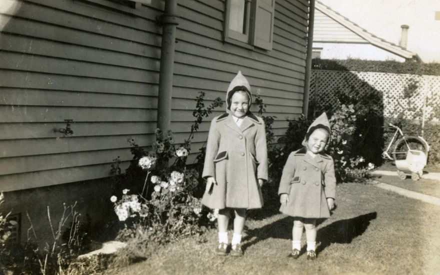 Pat (b.1941) and Diane (B.1946), the daughters Freda and Thomas Hayes, picutred in the backyard of their home at 11 Anderson Place, Palmerston North.