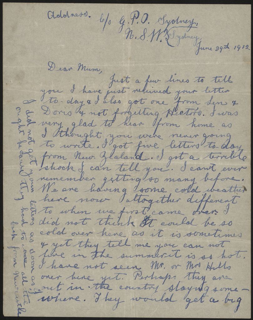 Pat (Percival) Argyle (1890-1915) was the son of Henry and Alice Argyle of Bunnythorpe. At the time of this letter to his mother he was in Sydney and talks about what it is like. Mentions Jimmy Neil from Palmerston in the South Island.