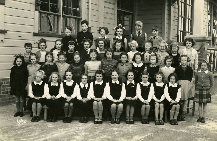 College Street School pupils. From left. Back row: Alan Pratt; Richard Conners; Judith Sears; Jennifer Poole; David Driver; Paul Pirani. 3rd row: Janet Radford; Unknown; Dianne Broughton; Elinor Patterson; Valerie Dooney; Lois Fifield; Rayma Foster; Robin Crossley; Unknown; Delys Grover; Barbara Everson; Shirley Richardson. 2nd row: Pat Hayes; Gloria Rossiter; Diane Just; Gaye Gorman; Valerie Mabey; Shirley Truman; Thelma Larsen; Pat Drake; Berys Simpson; Susan Rush; Prue Carr; Jeanette Wilde; Louise Stewart. Front Row: Colleen Campbell; Margaret Cox; Jan Hastie; Betty MacIver; Valerie Bain; Diane Simmons; Jennifer Sargeant; Susie French; Jennifer Pratt; Rosalind Caird.
