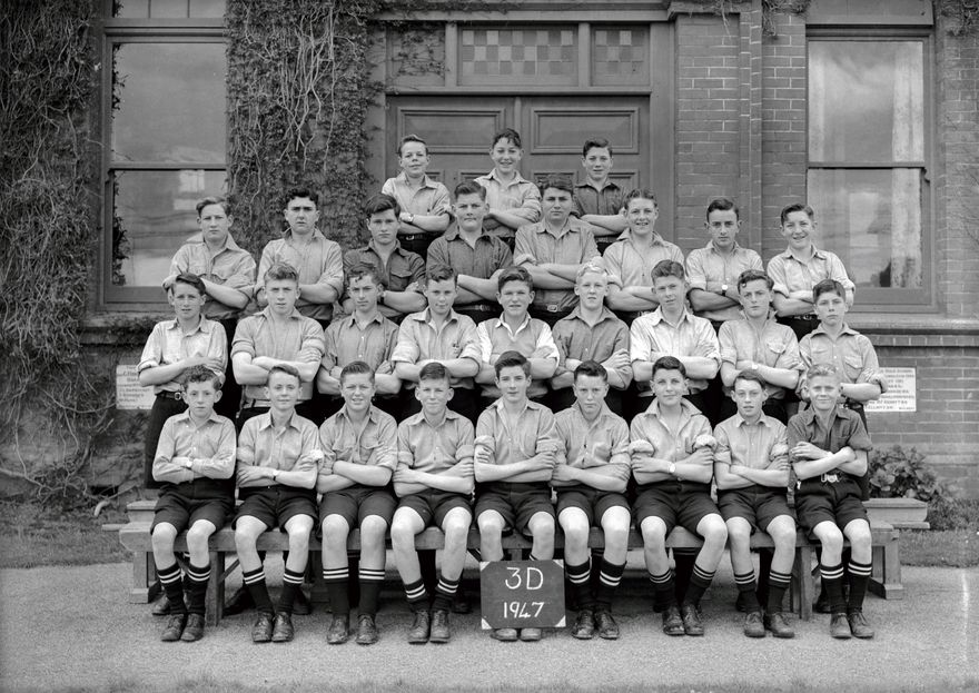 The 3D class of 1947 group pose for their photograph. L Ayrton, R Bower, P Campbell, A Chowen, P Darby, R Davidson, N Dickins, G Field, J Grimmer, A Hart, J Harvey, N Harvey, W Hughes, L Larsen, E Newth, B Perry, J Ranger, J Riddle, P Rieger, D Robertson, L Robertson, W Scott, L Shannon, W Shannon, R Sinclair, J Short, W Whisker, A White, W Whitehead, D Williams, A Williamson.