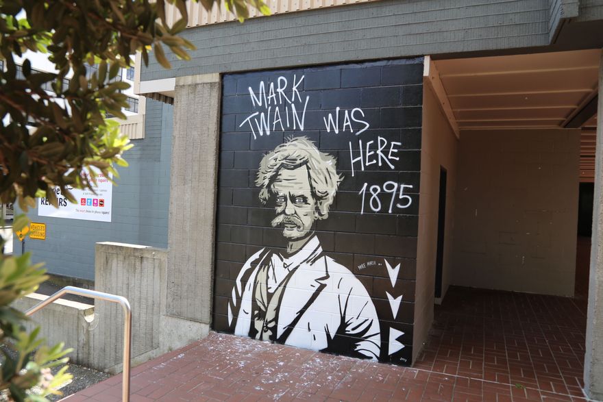 - Jam TV were running a documentary on behalf of TVNZ to cover Mark Twain’s lecture series across NZ, which was part of a world tour across the British colonies in 1895. The documentarian approached Palmerston North City Council, after finding out that Palmerston North had a growing street art scene, suggesting that a local artist do a piece based on Mark Twain, and talk about their views or knowledge of Mark Twain as part of the visit. Whanganui artist Mike Marsh (who was exhibiting at Safe As Gallery at the time and had recently completed a piece in Berrymans Lane for Beats, Bites, and Brushes) was commissioned by PNCC, through the city’s Placemaking Initiative, to do a portrait of Mark Twain in recognition of his visit to Palmy. This image shows the completed mural, on the edge of 'Red Square', off Main Street.