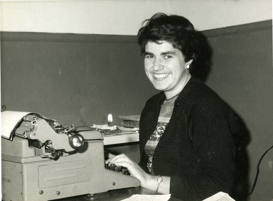 Elaine Thompson as a young woman, typing during the New Zealand Presbyterian Church General Assembly held at St Andrew’s church Palmerston North.