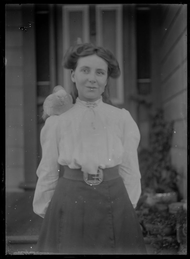 This photograph was created by William James Young in the early 20th century. A large variety of subjects are depicted in the collection, but family, rural life and travel are the most prominent themes. The exact location of the photographs in the Young Collection is unknown, but W J Young lived on a farm in Mt Stewart, Rangitikei, and some of the photographs include his house. The Young family were apparently avid travellers and photographs later in the collection feature scenes from Rotorua, Auckland, Whanganui, as well as other unidentified locations. The portraits are all unidentified, but are presumably of members of the Young family. The photographers parents were George Henry (b 1833) and Jane McDowell (b 1842, d 1916). They came to New Zealand in 1877. The same year, they bought the home farm on Mt Stewart and called it Kilrudden after Kilrudden House, the home of the McDowell family in Ireland. The couple had four children: Ann (b 1873), Margaret (b 1876), John (b 1878) and William James (b 1880). William James married Mary Elizabeth Thompson and they had four children: Doris (b 1914, d 1989), George (b 1916, d 1991), Royden McDowell (b 1925, d 1992) and Noel William (b 1927, d 2013).