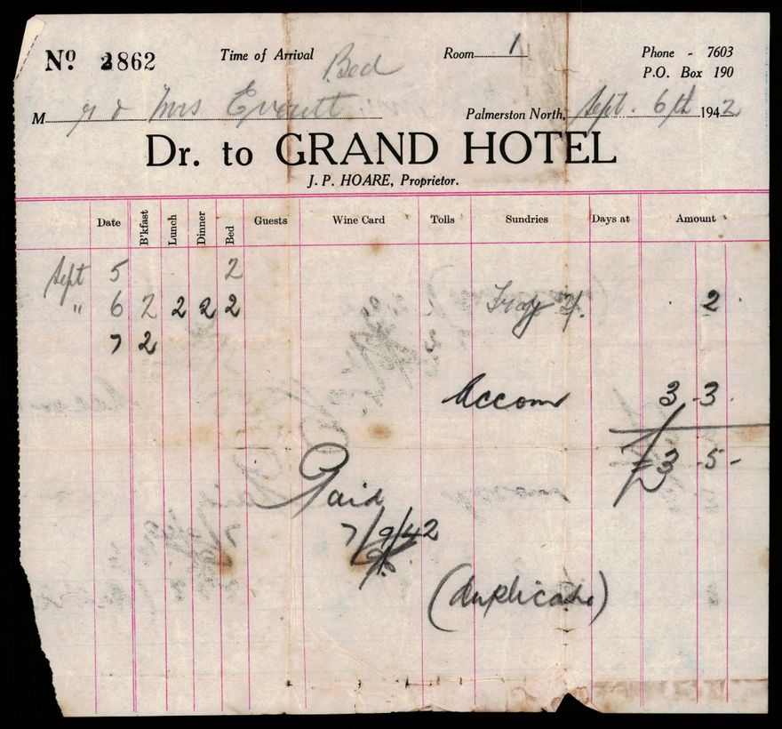 Mrs. Mary Elizabeth Everitt, and Mr. Noel Sheffield Everitt, originally of Masterton, visited Palmerston North for their honeymoon in 1942. The items in this collection are the result of their stay at the Grand Hotel (The Square).