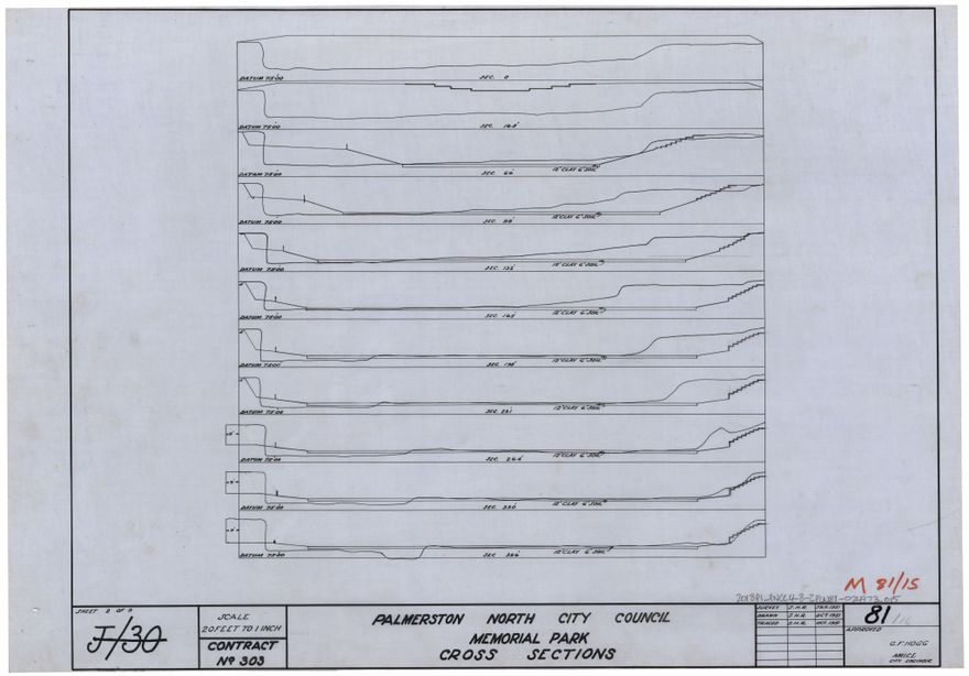 The Palmerston North City Council purchased the site of the old railway ballast pit in 1938 and developed it into a recreational and sporting area. A memorial to citizens killed in World War Two (WWII) was erected and in 1954 Fitzroy Park was officially dedicated as Memorial Park. These plans are not all of the same date but informed the development of the time. The plans cover the general layout, war memorial, running and cycle track, skating rink, clubrooms, dressing shed, toilets, seating, stormwater and cross sections. They also include the proposed plan of the skating rink at Himitangi, and plans for the Cooks Gardens and Western Springs stadium tracks.