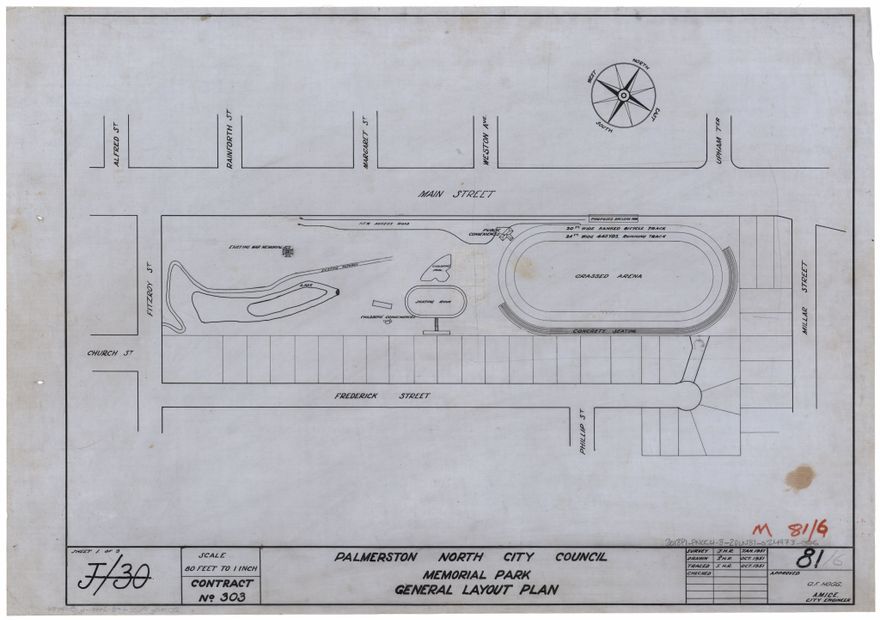 The Palmerston North City Council purchased the site of the old railway ballast pit in 1938 and developed it into a recreational and sporting area. A memorial to citizens killed in World War Two (WWII) was erected and in 1954 Fitzroy Park was officially dedicated as Memorial Park. These plans are not all of the same date but informed the development of the time. The plans cover the general layout, war memorial, running and cycle track, skating rink, clubrooms, dressing shed, toilets, seating, stormwater and cross sections. They also include the proposed plan of the skating rink at Himitangi, and plans for the Cooks Gardens and Western Springs stadium tracks.
