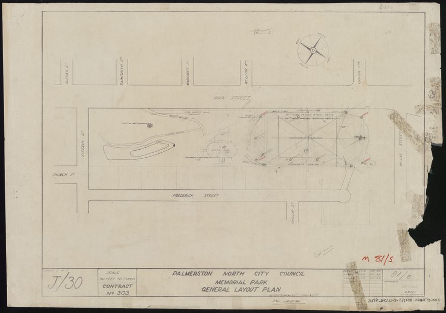 - The Palmerston North City Council purchased the site of the old railway ballast pit in 1938 and developed it into a recreational and sporting area. A memorial to citizens killed in World War Two (WWII) was erected and in 1954 Fitzroy Park was officially dedicated as Memorial Park. These plans are not all of the same date but informed the development of the time. The plans cover the general layout, war memorial, running and cycle track, skating rink, clubrooms, dressing shed, toilets, seating, stormwater and cross sections. They also include the proposed plan of the skating rink at Himitangi, and plans for the Cooks Gardens and Western Springs stadium tracks.