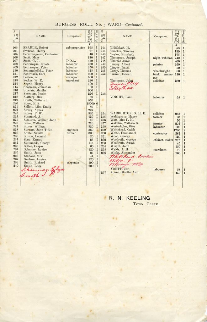 Published list of Palmerston North residents living in the number 3 ward, who were elegible to vote in elections for the Borough Council in 1894. During this period all adults who owned or occupied property were on the burgess roll, including women, and were entitled to cast 1-5 votes depending on the annual rateable value. The Borough was divided into wards for voting purposes 1884 - 1903.