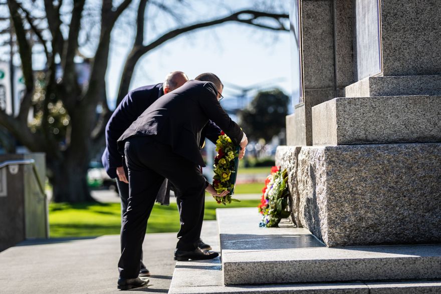 Palmerston North marked the 75th anniversary of the end of the second world war on 15 August, with a wreath-laying service at the Cenotaph in the Square. Dignitaries were piped on to the concourse by the Pipes and Drums of Palmerston North. As well as the wreath laying, city flags flew, a lament was piped and the clocktower bells rang.