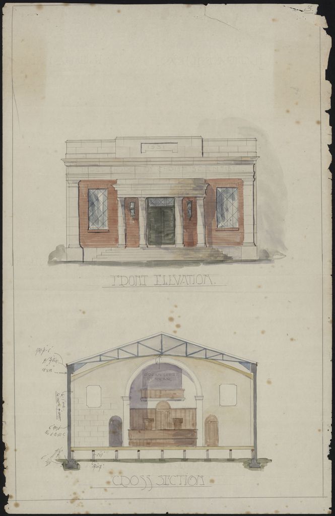 https://d28dhd8eubcyz4.cloudfront.net/iiif/2/curtis-production2-cache%2F1%2F4%2F6%2F848a6f-c875-46c2-9781-2f4e71a2abbf%2Fresize_master_d6d0cf49c50eed72faf7b8e575bc3fbe.jpg/full/!880,1024/0/default.jpg?sig=bd05ea6b6bf91cada7512b1566349e754b8b815d&ver=1655547062Plan for First Church of Christ, Scientist - Front Elevation and Cross Section
