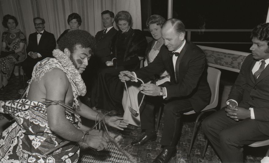 This image was taken for a story that ran in the Manawatu Evening Standard on 10 October 1970. The story ran: "Fiji became an independent nation today exactly 96 years after the islands were ceded to Queen Victoria by Fiji's King Charles, handed the islands back again in a ceremony watched by many descendants of the Fijian King. In Palmerston North, a Fijian Independence Day celebration was held on the evening of October 9. A welcoming ceremony in traditional style had been arranged by the Fiji students' association at Massey University. The 30 minute welcome included the presentation of a tambua (whale's tooth) to Palmerston North mayor, Desmond Black. Tambua is a symbol of authority, dignity and respect. Eight guest including Mr Black were served with the country's national drink, Kava."