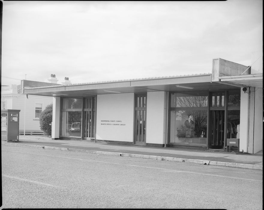 An exterior view of the building housing the Shannon Library (left), the Horowhenua County Council Branch Office (centre) and the clothing store Bettina's Boutique (right).