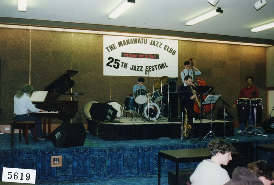 Blue Bossa Jazz Ensemble performing at the 25th Annual Manawatū Jazz Festival. L-R: Gary Wilby (piano) Lance Philip (drums) Murray Biggs (soprano saxophone) Alistair McLeod (bass) Colin Chase (congas)