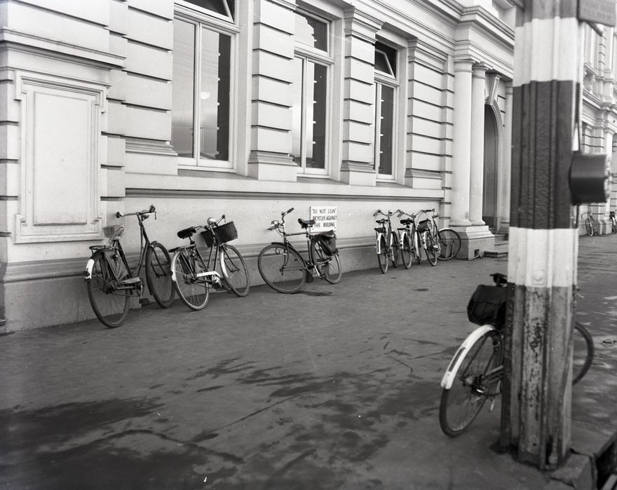 This image was taken for a story that ran in The Manawatu Evening Standard on 19 June 1957: "The sign in this photograph prohibits the parking of bicycles against the Post Office building and is heeded by some residents of the City. The owners of these cycles seem to have no respect for public property."