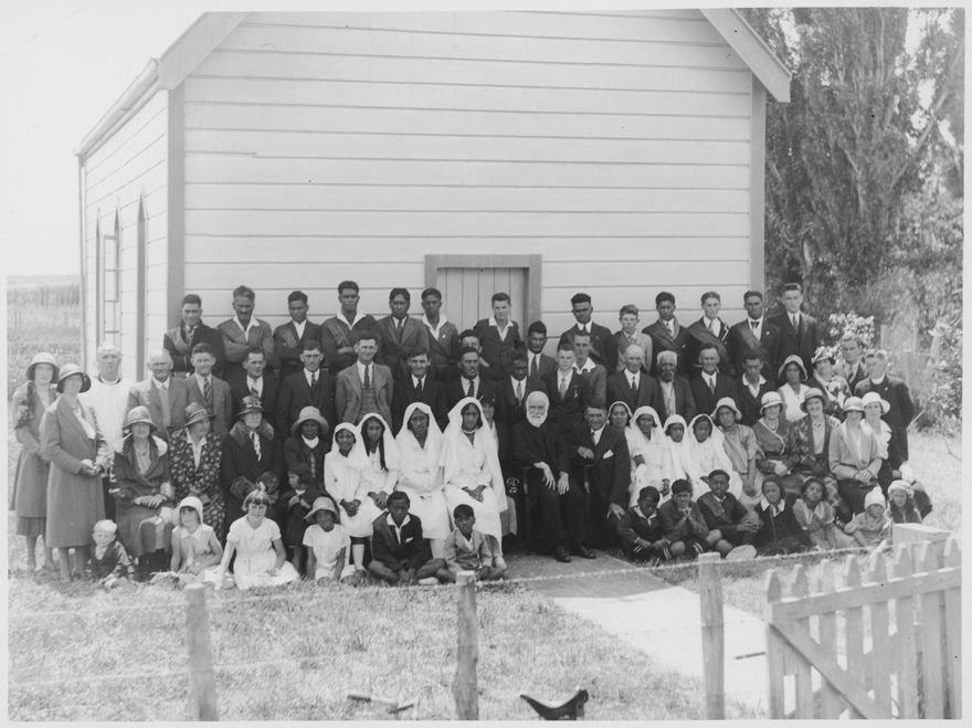 A group of people outside a church, at what might be Kauwhata (Kai Iwi Marae). The occasion might be for confirmation. The same people are in 2018P_2018-30_025218.