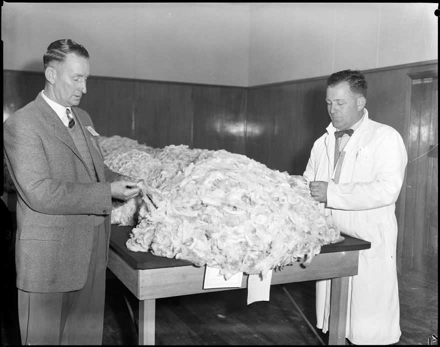 This image was taken for a story that ran in The Manawatu Evening Standard on 7 July, 1959. "These men are inspecting the New Zealand champion Merino fleece at the wool block at Massey College, where the woolgrowers conference opened this morning. They are Messrs I. A. M. Lang (left), and R. A. Weber, both members of the executive of the New Zealand Woolgrowers' Federation." Other photos associated with this article were published on the same day.