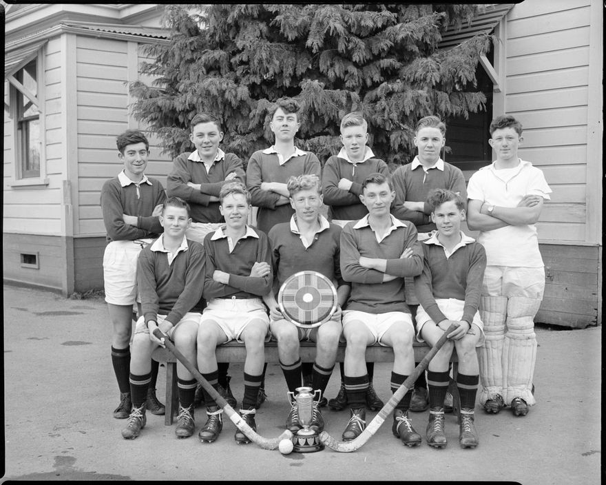 A group of eleven male students pose with hockey sticks and two trophies. The Palmerston North Technical High School was opened in September 1909 on what is now Princess Street, Palmerston North. In 1956 the school moved to the Rangitikei Street site and became known as Queen Elizabeth Technical College. The original building and site is now used by the Universal College of Learning [UCOL]. This negative comes from the Elmar Collection - a large series of semi-identified and unidentified images from the 1930s-1970s.