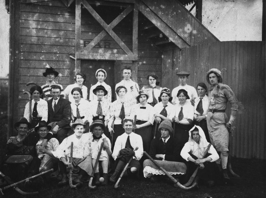 High School Old Girls and Boys after a hockey match at the Showgrounds. From left. Back Row: J Grant, V Graham, I Kerslake, G Halwood, J Koehler, ? Ihle. Second Row: F Forsaith, A Anderson, S Bett, V Archer, M West, M Hodder, O Bett, M McKenzie, H Bett, B Hardie. Front row: C Aicheson, J Nash, N Nielsen, J Barnard, G Perrin, W West, Unknown