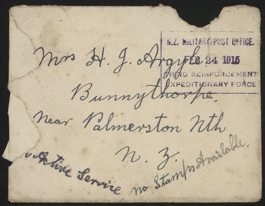 Envelope addressed to Mrs Henry (Alice) Argyle of Bunnythorpe, from one of her sons, Pat or Len, who served overseas in World War One. Both men died at Gallipoli in 1915.