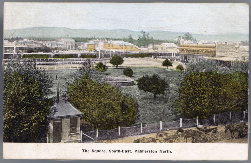 This postcard of the Square shows its south side, from Church Street West to just after Main Street West. Most of the building's names are obscured, but the distinctive architecture of the old Municipal Chambers (now Square Edge) identifies it as the eighth building from the left. The Coles Building (now the PNCC Central Administration Building) is also visible fourth from right. Note that there is a train running through the middle of the postcard. The small structure in the left foreground of the image is the old stables and several horse carts are shown waiting in front of it. In the middle of the image is a fountain - this was eventually combined with the Coronation Monument (not erected at this time) to create the Coronation Fountain that currently stands in the corner of the Square near Broadway Avenue. There is a note on the front of this postcard that reads, "Note the fishpond exactly opposite the tearoom windows".