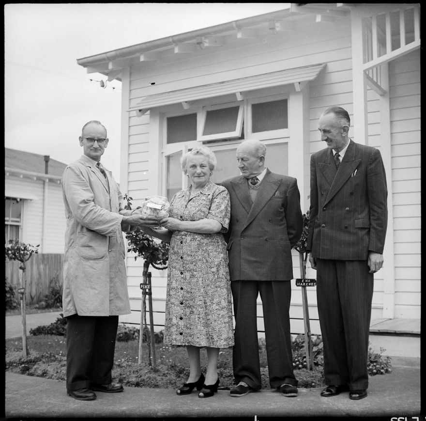 This image was taken for a story that ran in The Manawatu Evening Standard on 11 November 1960 "Mrs. G. Wright, of Pirie Street, Palmerston North, who was one of the original shareholders in the Manawatu Consumers' Co-operative Society, has been dealing with the company since 1935. Today Mrs. Wright, together with the other original shareholders, was remembered on the occasion of the silver Jubilee of the company and received a gift to mark the occasion. In the photograph are (from the left): Mr. F. Betteridge, who presented the gift to Mrs. Wright, Mr. Wright, and Mr. D.H. McColl, the chairman of the directors in the society."