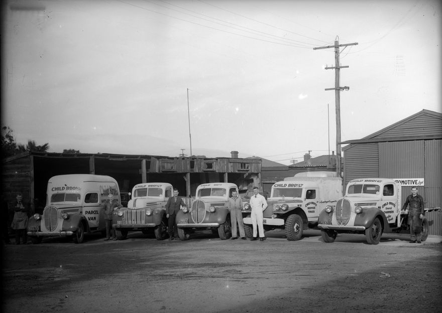 Unidentified employees of Child Brothers Ltd stand beside their vehicles. From left: Parcel Van, Number 5 Carrier, Carrier, Commando Service Truck, Number 6 Carrier. Child Brothers Ltd, Carriers and Fuel Merchants, was established in 1919 by Edward G Child and his sons, W J Child & E W H Child. They opened the metal crushing depot and plant at the end of Albert Street near the Manawatu River c 1927. The first vehicles owned by the company were horse drawn and motor vehicles were added to the fleet during the 1920s – 1930s. The firm eventually became the largest carrying business in the Manawatu District. By 1974 the business was being conducted under the name Child Freighters Ltd and later became known as Child Metal Ltd.