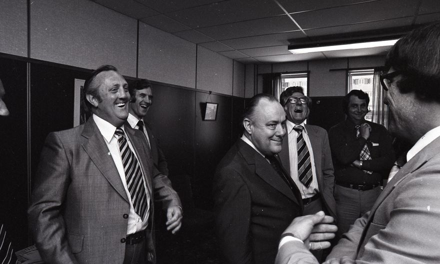 This image was taken for the Manawatū Evening Standard on 17th November 1978. Prime Minister Rob Muldoon visited the Manawatū Evening Standard offices, prior to the General Election held on 25th March 1978. Muldoon toured the country in the days leading up to the election, sometimes encountering hecklers and abuse outside planned events. During his visit to Palmerston North, he announced intentions to reimpose wage controls if unions continued strike action. Although the National Party won the election with a reduced majority, local electorate seats changed hands, with Labour's Joe Walding regaining the Palmerston North electorate from John Lithgow, and Social Credit's leader Bruce Beetham regaining the Rangitikei electorate from National's Les Gander.