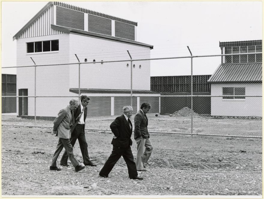 The Manawatu-Oroua Electric Power Board’s building committee inspect the substation; from L to R: Roger Meads (Engineer-Manager); Murray Macphee (Engineer); Matt Green and Russell Signal (Board Chairman). This substation, in Flygers Line near the corner of Milson Line, has been designed to blend into its residential surroundings. At the time the photograph was taken the substation was not finished and had still to be landscaped.