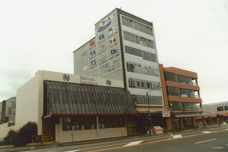 Near the intersection of Walding Street, the 7-storey centre building was the Head Office of Barraud and Abraham at 79-85 Rangitikei Street. Barraud and Abraham began in Manawatu in 1881, initially as a seed and produce merchant and later a wholesale general merchant.