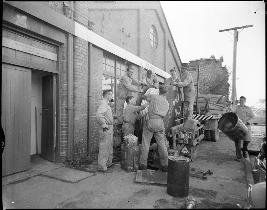 This image was taken for a story that ran in The Manawatu Evening Standard on 23 June, 1959. "The coaxial cable which is at the moment being laid from Wellington to Palmerston North is very near the end of its journey, it is on its last stage now. Seen above are members of the Post and Telegraph Department feeding the cable down a manhole. At the time when this photograph was taken they were just past the Grand Hotel and now have to go just past the police station in Church Street to the new telephone exchange." Another photo associated with this article was published on the same day.