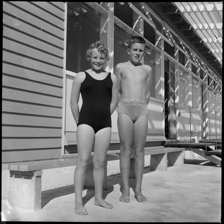 This image was taken for a story that ran in The Manawatu Evening Standard on 7th March, 1963. "A proud smile from these two swimming champions, Margaret Steer and Neil O'Hara, of the Monrad Intermediate School. They are the first title-holders of the new school."
