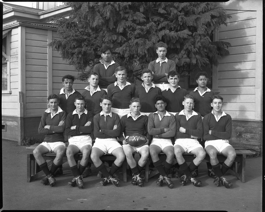 A group of fifteen male students dressed in rugby uniform. The Palmerston North Technical High School was opened in September 1909 on what is now Princess Street, Palmerston North. In 1956 the school moved to the Rangitikei Street site and became known as Queen Elizabeth Technical College. The original building and site is now used by the Universal College of Learning [UCOL]. This negative comes from the Elmar Collection - a large series of semi-identified and unidentified images from the 1930s-1970s.