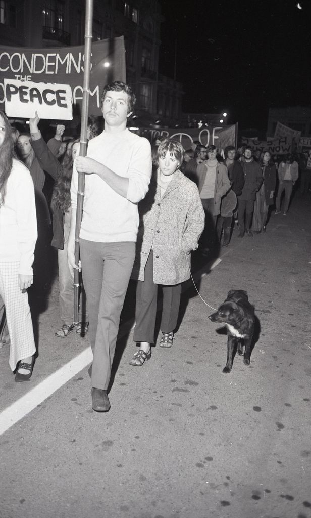 The March was organised by the Palmerston North Anti-war Mobilisation Committee, including R. Lyall, Massey University Student Association President Gary Emms, and Unionist Alan Millar. The Nash Street Jug Band lead the singing and Hana Burke sang ‘a Maori song of parting’. Poetry was read by Mr. Lyall and Des Woods. The Reverend Loyal Gibson of the Trinity Methodist Church lead prayers after Churches across the city rang their bells in solidarity.