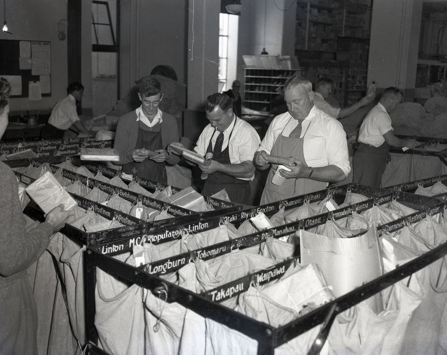 - This image shows postal workers sorting packages for delivery around New Zealand. They workers are unidentified, the location is thought to be in Palmerston North GPO.