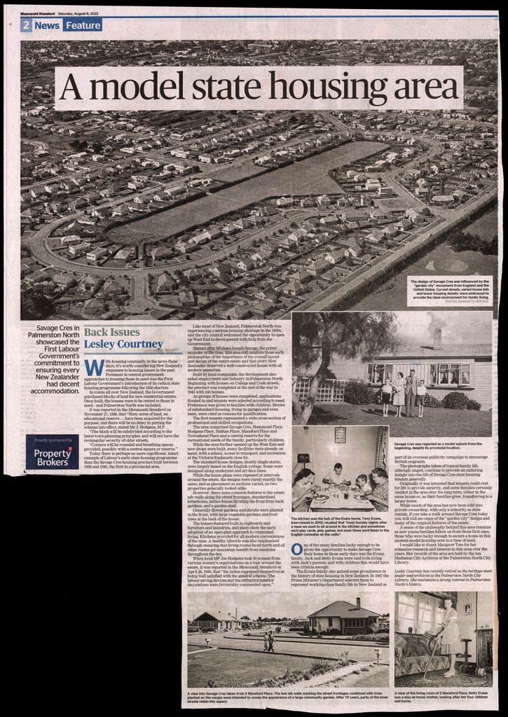 Local historians weekly "Back Issues" article in the Manawatū Standard. The Savage Crescent housing precinct was built between 1938 and 1945, the first state housing project in a provincial area. It showcased the First Labour Government's commitment to ensuring every New Zealander had decent accommodation.