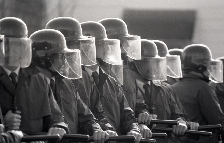 This image was taken (but not used) for a story that ran in The Manawatu Evening Standard on 01 August 1981. The Standard reported that as many as 1000 police were involved in planning for protests on game day, including the specially formed ‘Red and ‘Blue’’ riot squads.