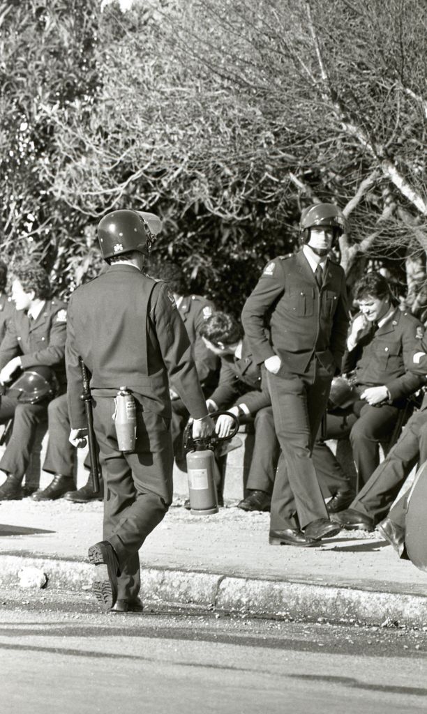 This image was taken (but not used) for a story that ran in The Manawatu Evening Standard on 01 August 1981. The Standard reported that as many as 1000 police were involved in planning for protests on game day, including the specially formed ‘Red and ‘Blue’’ riot squads.