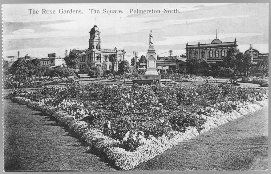 The rose gardens in The Square were laid in the early 1900s. Also shown in this photograph are the Statue of Te Peeti Te Awe Awe (built 1907) and to the left of that the old Post Office. This was Palmerston North's fourth Post Office and was built in 1905-1906. The clock tower was removed after the Wellington earthquake in 1942, but the mechanism was later used in Hopwood Clock Tower.