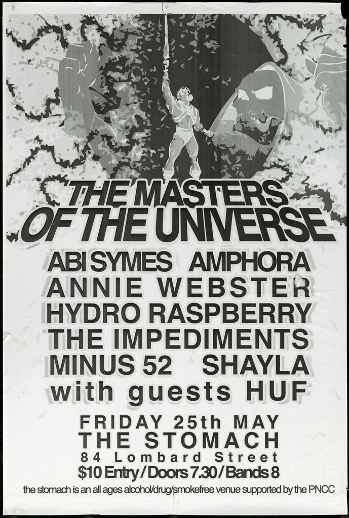 The Masters of the Universe. Abi Symes, Amphora, Annie Webster, Hydro Raspberry, The Impediments, Minus 52, Shayla, with guests Huf. Friday 25th May. The Stomach 84 Lombard Street. 410 Entry/Doors 7.30/Bands 8. The Stomach is an all ages alcohol/drug/smokefree venue supported by the PNCC. Part of a collection of posters that were displayed at The Stomach, Lombard Street, venue for Creative Sounds Society Incorporated.
