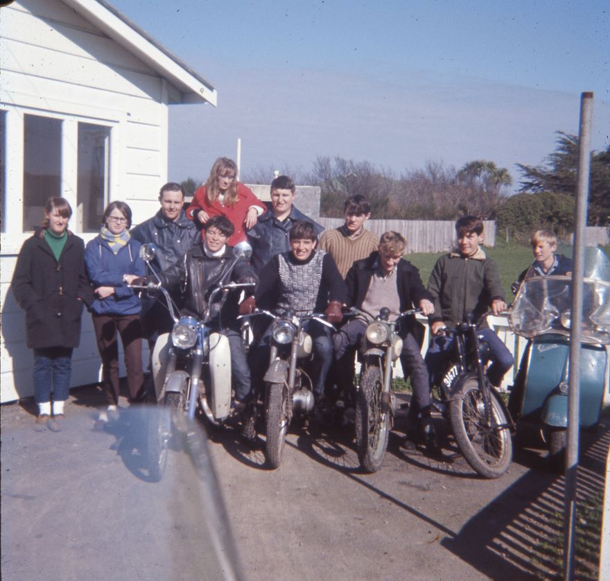 Students Toni Hercock, Janet Anderson, Bill Matheson, Ken Witton, Diane Johnston, Laurie Johnson, Ken Couler, Ron Harmon, Ken Parlane, Ian Gore, Tony Short, standing and sitting on their motorcycles, outside the hut at the Palmerston North Motorcycle Training School