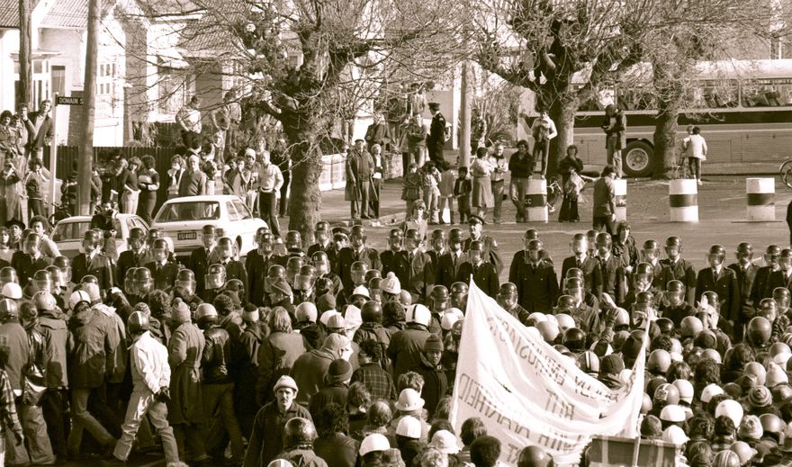 This image was taken (but not used) for a story that ran in The Manawatu Evening Standard on 01 August 1981. Extra police personnel were flown into Palmerston North in anticipation of game-day anti-Springbok Tour and anti-Apartheid protests. The Standard reported there were 1000 police, including a special riot squad, and 5000 protestors. The 1pm March culminated in a 24 minute standoff with the police lines on the corner of David and Cuba Streets.