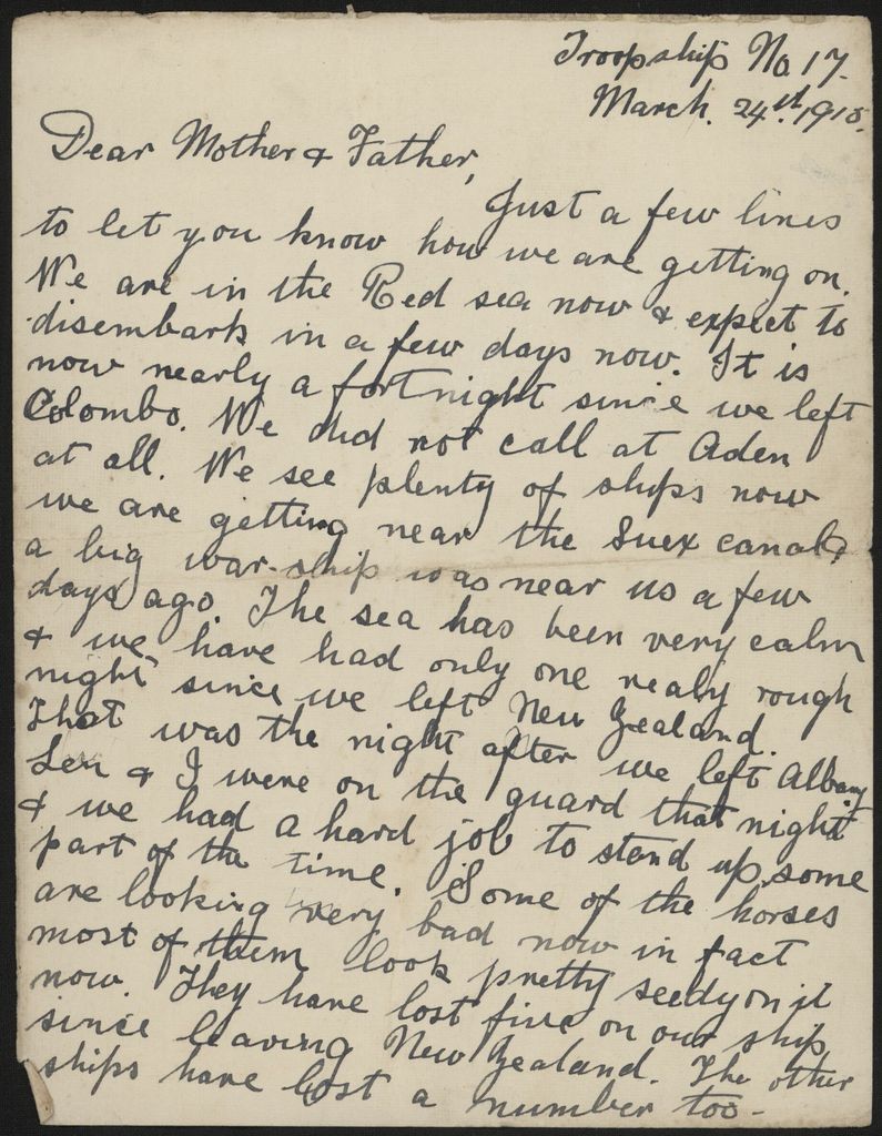 This letter from Pat to his parents is from the ship carrying them to Egypt. Len and Pat both died at Chunuk Bair in 1915.