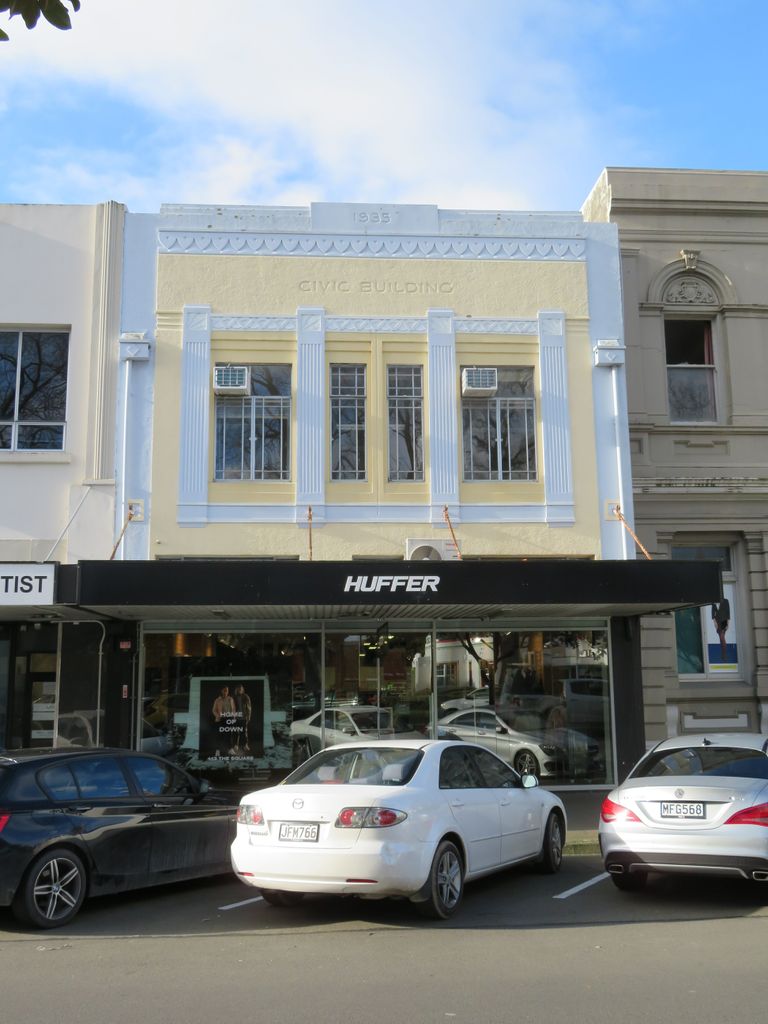The Civic Building was designed by Thorrold-Jaggard as part of the Waldegrave Estate. Tenders for the reinforced concrete building were called in March 1935, and it was duly erected between the Kosy Theatre and the Post Office, by Messrs Dickel & Kempson at a cost of £4,485. By 1939, it was occupied by the drapery shop of Miss Margaret Rae and Miss Iris Baker, and Dayal Patel’s fruiterer’s shop, with dentist Earle R. Wimsett’s based upstairs. By 1948, Woollams’ chemist had replaced the fruit shop, and a medical doctor had also moved in. These businesses remained in the shop for many years.
