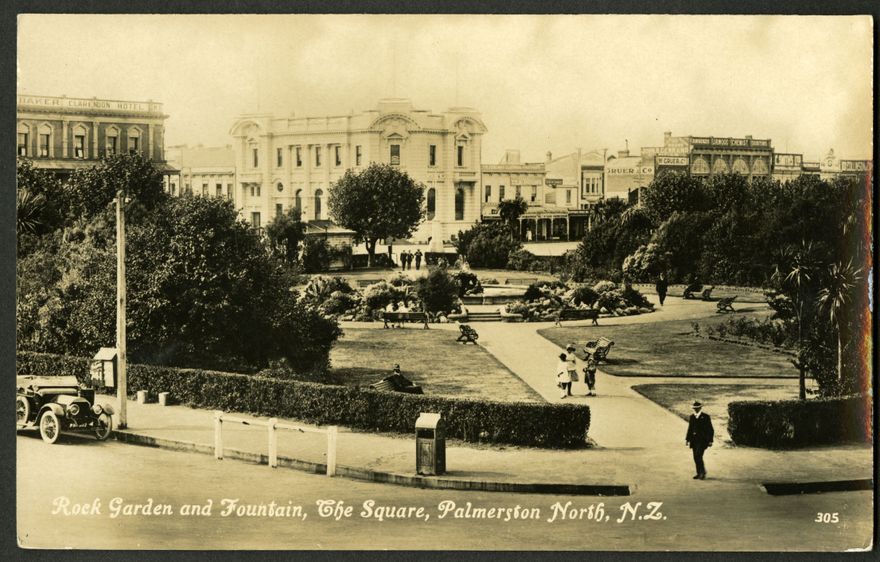 Looking across the rock garden and fountain in The Square to the Bank of New Zealand on the corner of Rangitikei Street. The BNZ was built in 1915 and Coronation Fountain shifted to the pond in 1925.