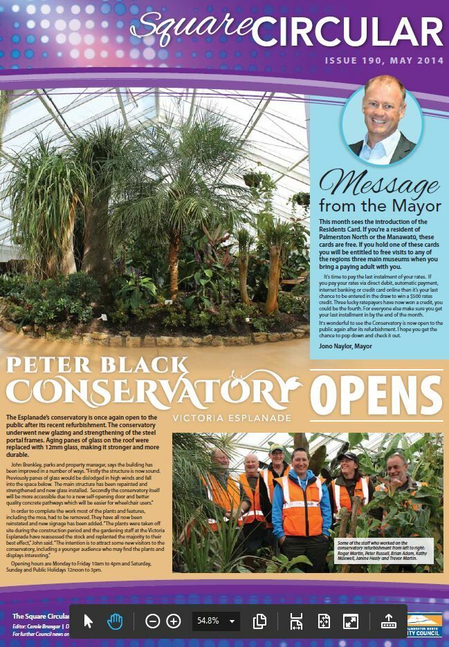 The Square Circular was Palmerston North City Council's monthly community publication, informing Palmerstonians of PNCC initiatives, activites, and events. This month's issue includes: Peter Black Conservatory; Jono Naylor; recycling; rubbish; Te Manawa; awards; The Globe; dog control; Jaycee Trust; conservation; rates; civil defence.