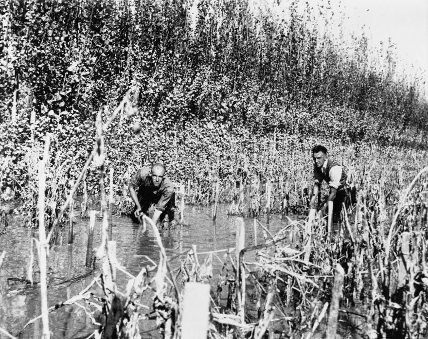 Digging dahlias during the big flood of 5 May 1941 at Arthur Shailer's nursery on Albert Street. The land was originally owned by his father, G. W. Shailer, who operated an orchard from Scandia Street mainly selling cherries and small fruit. From left: Sid Shailer; Horace Shailer