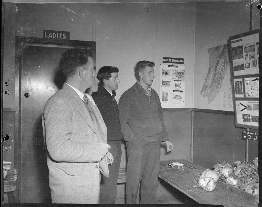 This image was taken for a story that ran in The Manawatu Evening Standard on 28 May 1958, page 10: "Young and old attend the meeting today of the Mangatinoka Farm School. Some of the younger farmers are seen here, before the meeting began, taking an interest in the many posters which decorated the walls of the hall."