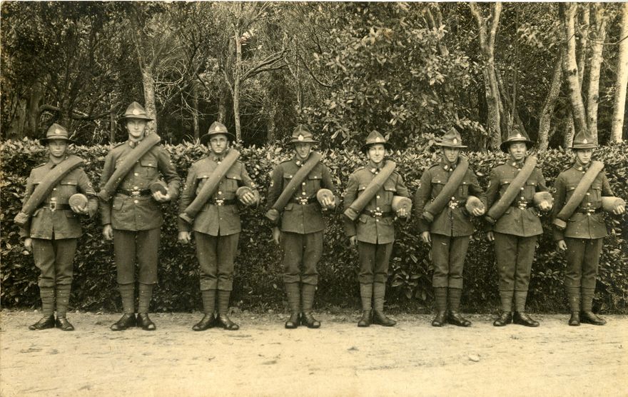 - Henry Ward (third from the left) as part of the Medical Corps. guard at Awapuni. - Reverse of postcard reads: Oct 22nd 1917 Guard Awapuni