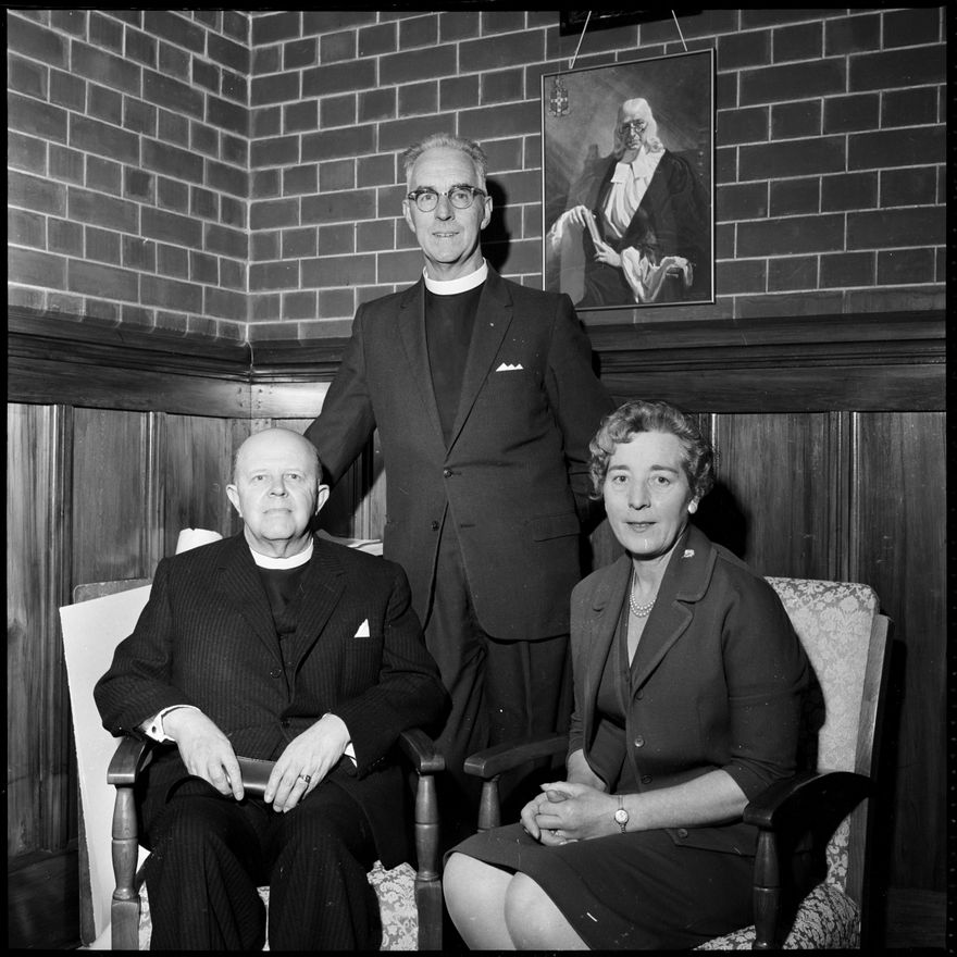 This image was taken for a story that ran in The Manawatu Evening Standard on 22nd March, 1963. "Lecturing to Methodists throughout New Zealand is Dr E. W. Baker, of Britain (left), accompanied by his wife (right). Standing is Rev. G. H. Goodman, a Methodist minister in Palmerston North. Doctor Baker, a well known writer on theology and a member of the World Council of Churches, delivered a sermon at St. Paul's Church in Palmerston North last evening."