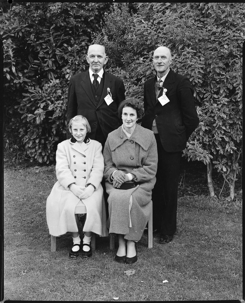 A group of two men, a woman and a girl attending a school jubilee. This was possibly the Jubilee celebrations for Bunnythorpe School, which opened on 13 August 1883 and would have celebrated its 75th anniversary in 1958. This negative comes from the Elmar Collection - a large series of semi-identified and unidentified images from the 1930s-1970s.